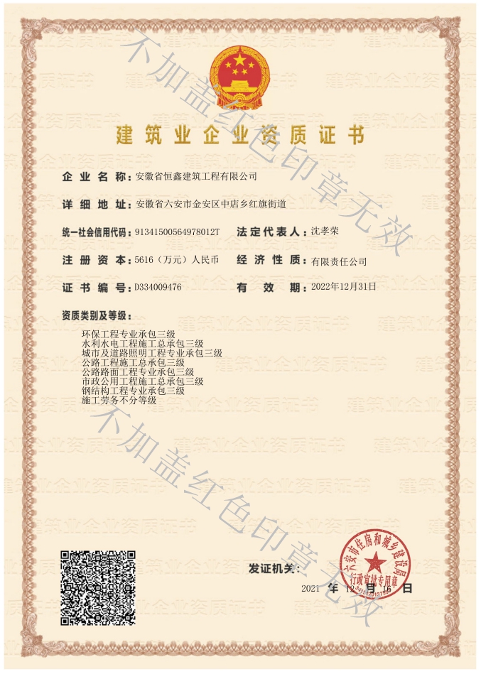 公司目前主要的資質(zhì)范圍:建筑工程施工總承包二級(jí),市政公用工程總承包三級(jí)、水利水電工程施工總承包三級(jí),公路工程施工總承包三級(jí);建筑裝修裝飾工程專(zhuān)業(yè)承包二級(jí),電子與智能化工程專(zhuān)業(yè)承包二級(jí)、建筑幕墻工程專(zhuān)業(yè)承包二級(jí),城市及道路照明專(zhuān)業(yè)承包三級(jí)、鋼結(jié)構(gòu)工程專(zhuān)業(yè)承包三級(jí),公路路面工程專(zhuān)用承包三級(jí)。